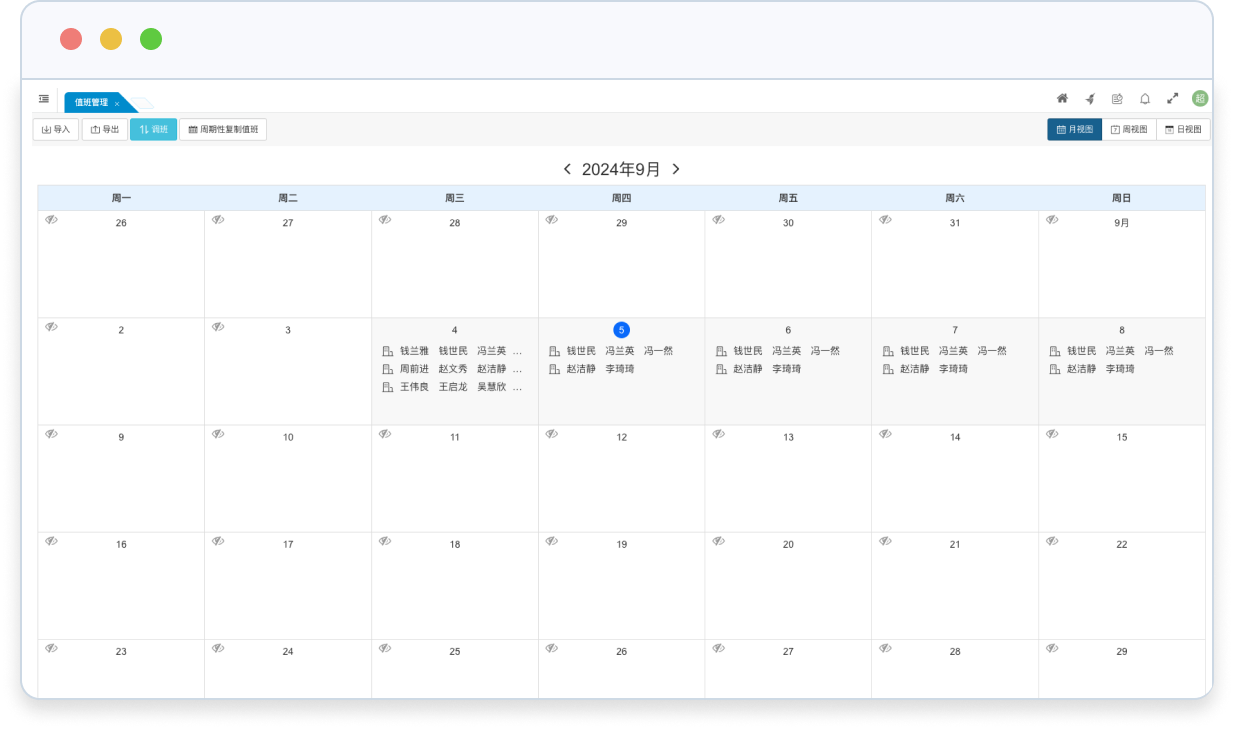 - 支持按日視圖、月視圖模式和周視圖模式對值班信息進(jìn)行管理,不同視圖適用于不同值班人員規(guī)模的排班需求。