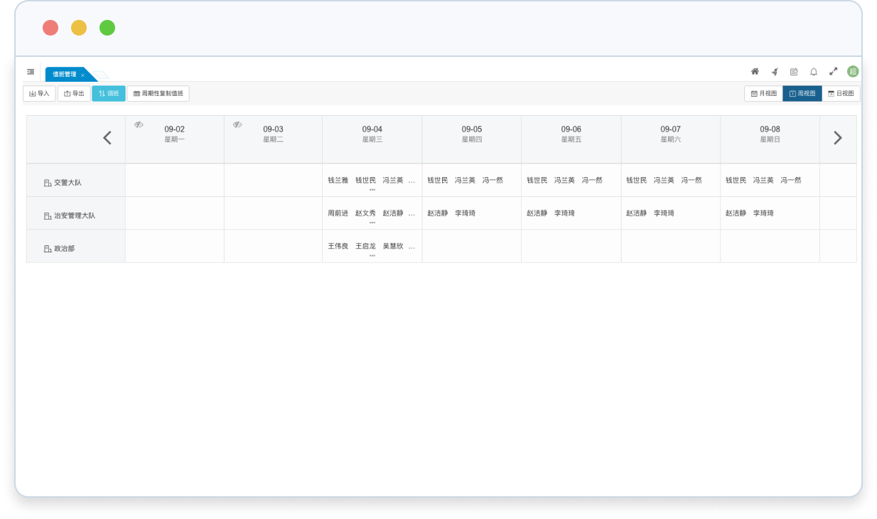 - 系統(tǒng)支持多種視圖模式對值班信息進(jìn)行管理,分別是日視圖、月視圖模式和周視圖模式。每種視圖都經(jīng)過精心設(shè)計(jì),旨在盡可能解決客戶排班時(shí)的各種痛點(diǎn)問題。三種視圖模式分別適用于不同值班人員規(guī)模的排班需求:當(dāng)部門少且每天的值班人員較少時(shí),月視圖可以一次性查看更多信息;當(dāng)部門較多但每天安排的人員不多時(shí),周視圖更為合適;當(dāng)部門和成員較多且每天安排的值班人員也很多時(shí),日視圖最適合
