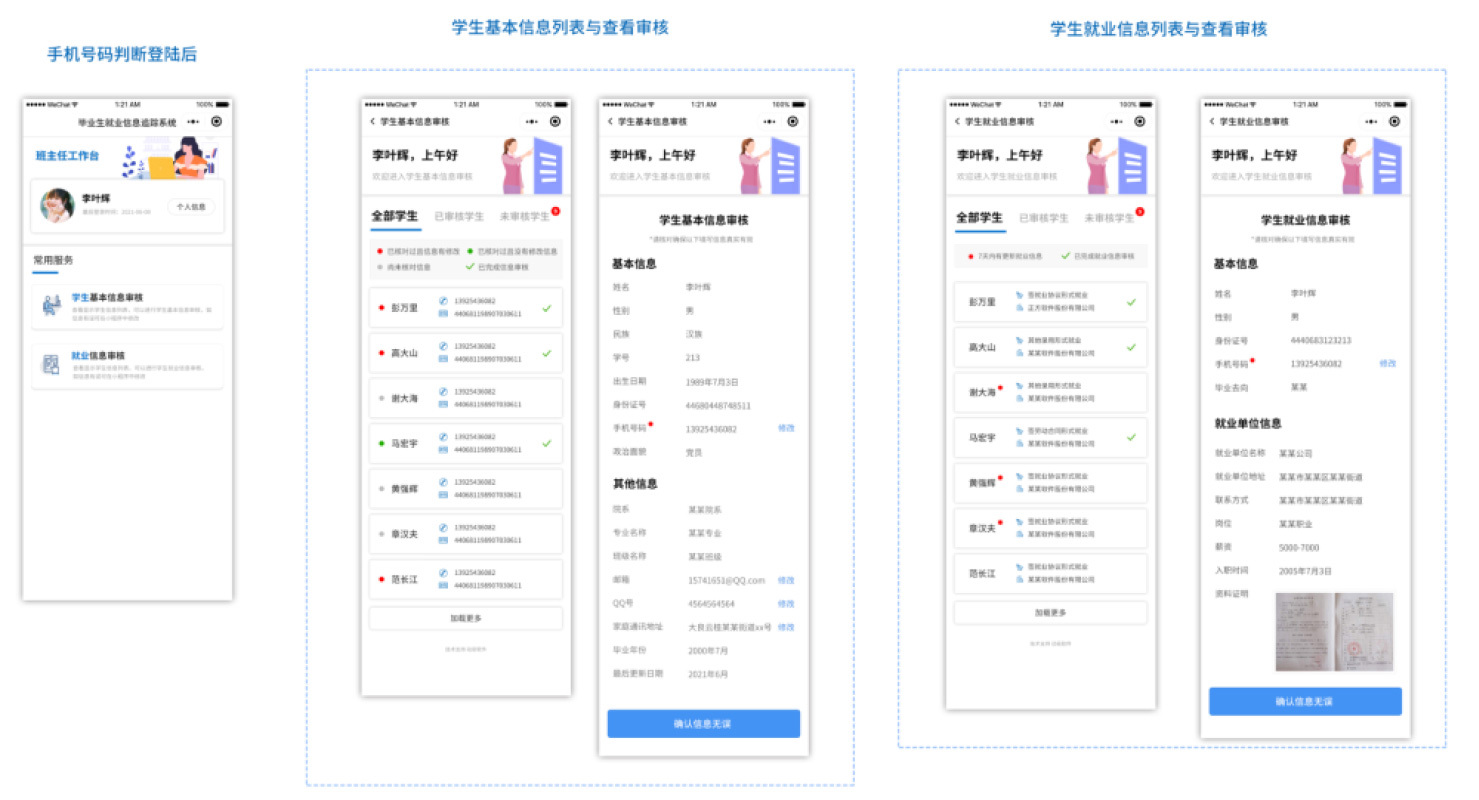 班主任(輔導(dǎo)員)掃碼進入小程序,小程序自動申請獲取當(dāng)前微信賬號綁定的手機號進行身份驗證,識別并確認班主任身份后,直接進入班主任工作臺界面,班主任能夠進行學(xué)生基本信息與就業(yè)信息的審核工作。