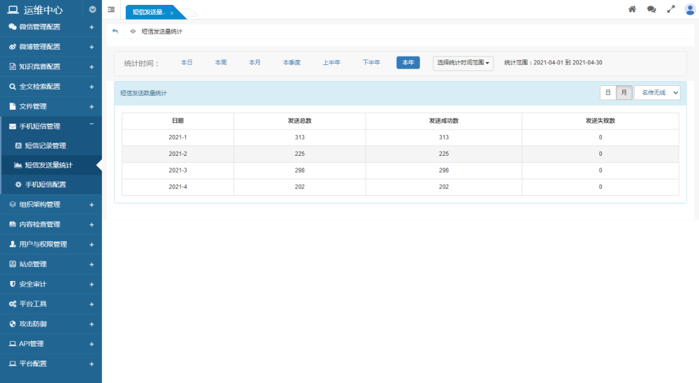 提供按日和按月兩種統(tǒng)計表。統(tǒng)計每日/每月發(fā)送的短信發(fā)送總量、發(fā)送成功數(shù)量、發(fā)送失敗數(shù)量。便于與短信服務(wù)商進(jìn)行對帳。