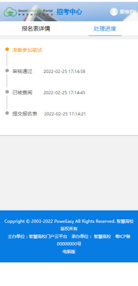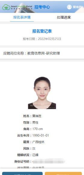 應(yīng)聘者可隨時(shí)查看自己的報(bào)名表。報(bào)名表上方通過(guò)進(jìn)度條顯示當(dāng)前狀態(tài)、處理過(guò)程和結(jié)果。