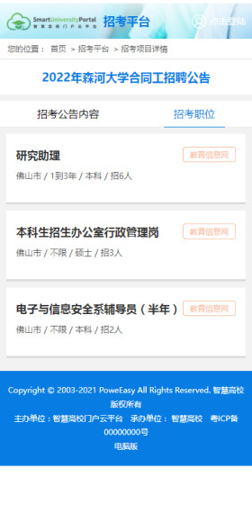 前臺(tái)支持顯示招考項(xiàng)目列表,用戶可以點(diǎn)擊項(xiàng)目名稱查看詳細(xì)信息,并在項(xiàng)目詳情頁(yè)中查看相關(guān)的招聘崗位列表。點(diǎn)擊崗位名稱后,可查看該崗位的詳細(xì)信息。