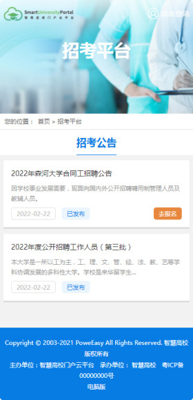 招考項(xiàng)目的操作包括:修改、刪除、設(shè)為當(dāng)前招考項(xiàng)目(始終只有一個(gè)項(xiàng)目為當(dāng)前項(xiàng)目)、發(fā)布/取消發(fā)布/設(shè)為公示中/設(shè)為過(guò)期。項(xiàng)目發(fā)布后,前臺(tái)的招聘模塊頁(yè)面會(huì)自動(dòng)顯示招考公告。