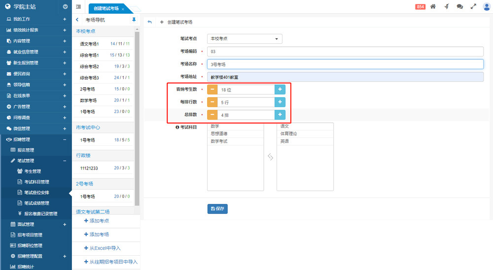 考點(diǎn)和考場(chǎng)的管理功能集成在“筆試座位安排”的考場(chǎng)導(dǎo)航中欄,無(wú)需單獨(dú)的管理菜單。