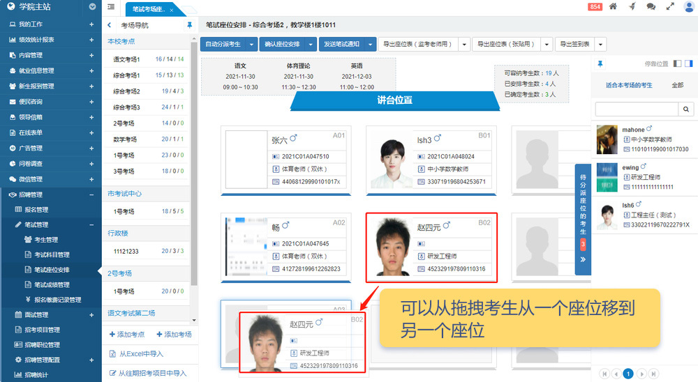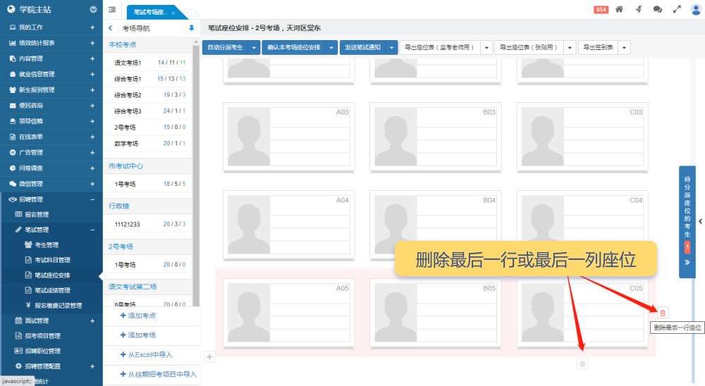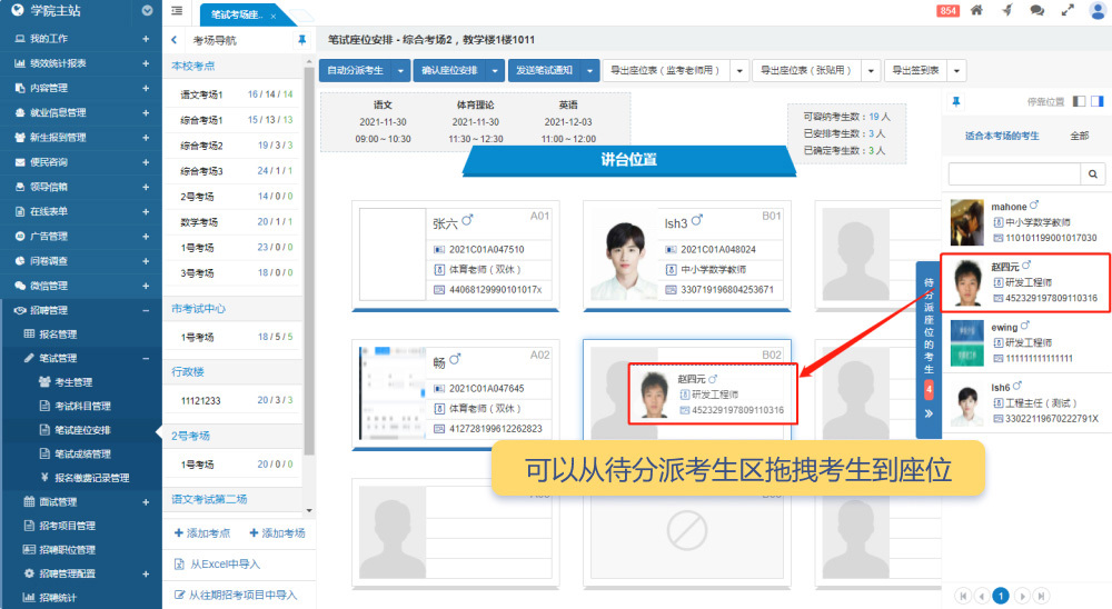 筆試考生管理界面類似于報(bào)名管理界面,中欄顯示本次招考項(xiàng)目的職位列表,每個(gè)職位后面顯示進(jìn)入筆試流程的考生總數(shù)。如果有“待安排座位”的考生,會(huì)有紅點(diǎn)進(jìn)行提醒。中欄頂部支持切換不同的招考項(xiàng)目。