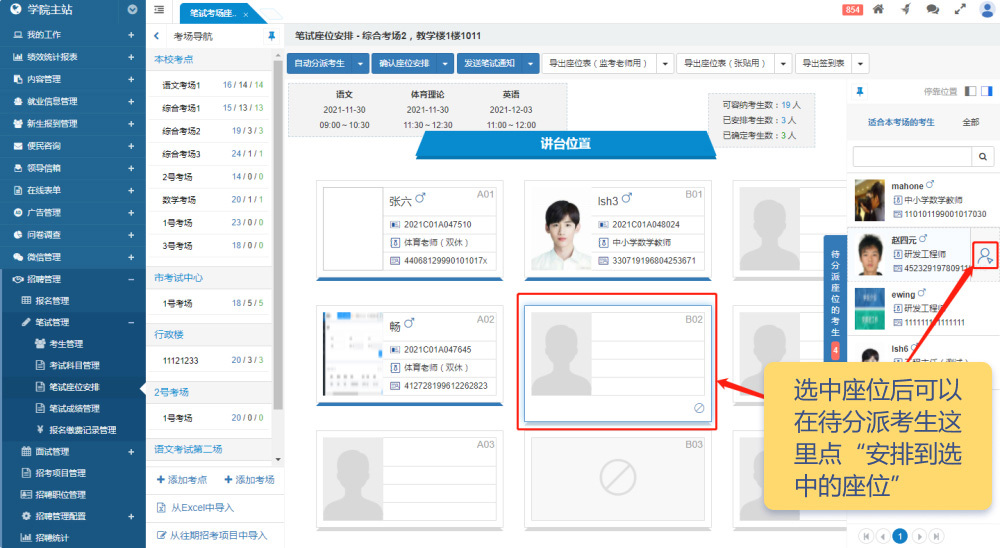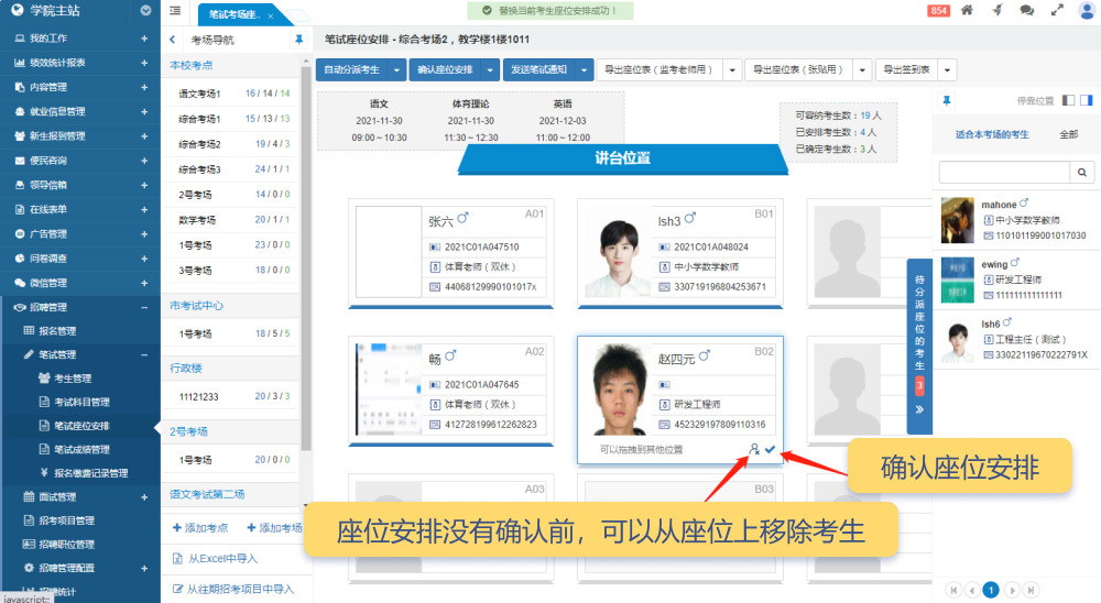 在后臺(tái)管理界面中,中欄顯示考點(diǎn)和考場(chǎng)導(dǎo)航信息。右側(cè)展示座位安排表,以所見(jiàn)即所得的方式顯示每個(gè)座位的考生信息。同時(shí),右側(cè)還包含“待分派座位的考生”區(qū)域(僅在有待分派考生時(shí)顯示)。