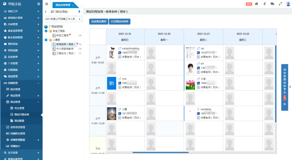 系統(tǒng)的中欄顯示本次招考項(xiàng)目的職位列表,每個(gè)職位名稱后標(biāo)注進(jìn)入面試流程的考生總數(shù)。若有“待安排面試時(shí)間”的考生,系統(tǒng)會(huì)以紅點(diǎn)提示。右側(cè)顯示待安排面試的考生列表,中間則為面試日程安排表。