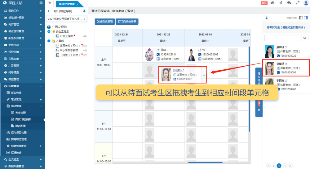 面試日程安排表的列為指定的招聘日期,行為面試時(shí)間段,每個(gè)單元格顯示該時(shí)間段的已安排面試考生及其報(bào)考崗位。點(diǎn)擊左側(cè)的招聘崗位,表格將篩選出該崗位已安排面試的考生;點(diǎn)擊右側(cè)的“待安排考生”,表格則篩選出該考生對(duì)應(yīng)崗位的已安排考生。用戶可以將“待安排考生”拖拽到未安排面試的時(shí)間段,也可以在不同時(shí)間段間拖動(dòng)考生。若一個(gè)時(shí)間段內(nèi)有多個(gè)考生,還可通過(guò)拖拽調(diào)整順序。已安排好的考生可隨時(shí)移除以重新安排。
