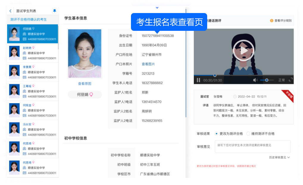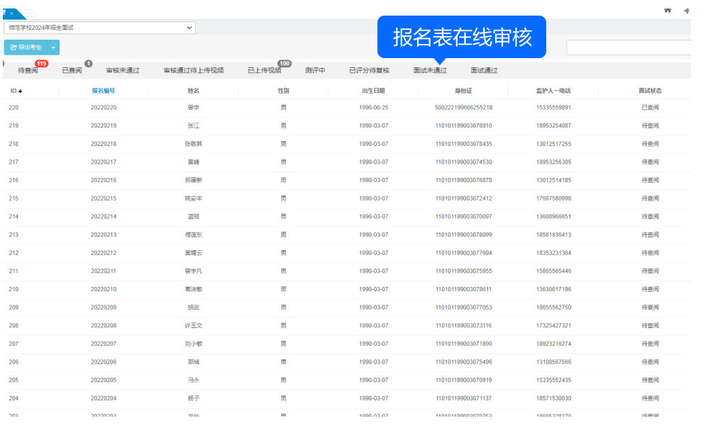 針對(duì)報(bào)名表的處理提供了豐富的操作選項(xiàng),包括查看報(bào)名表、審核通過(guò)、審核不通過(guò)、撤消審核不通過(guò)、打印報(bào)名表、刪除報(bào)名信息、刪除考生及報(bào)名信息等,并支持這些操作的批量處理,極大地提高了工作效率。查看報(bào)名表后自動(dòng)將狀態(tài)改為“已查閱”。