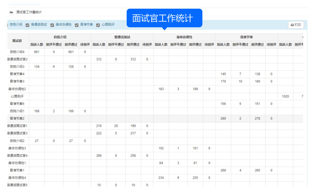 支持招生負(fù)責(zé)人在評(píng)委工作量統(tǒng)計(jì)頁(yè)面查看每個(gè)測(cè)評(píng)項(xiàng)目中的“已指派、測(cè)評(píng)不通過(guò)、測(cè)評(píng)通過(guò)、待測(cè)評(píng)”人數(shù),以及每個(gè)評(píng)委所負(fù)責(zé)的測(cè)評(píng)項(xiàng)目的工作量情況。若發(fā)現(xiàn)某評(píng)委長(zhǎng)時(shí)間存在“待測(cè)評(píng)”的考生,系統(tǒng)可提醒評(píng)委及時(shí)完成測(cè)評(píng),確保流程順利進(jìn)行。