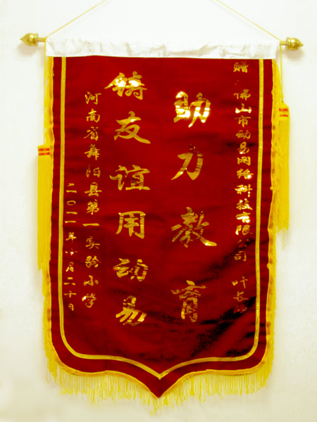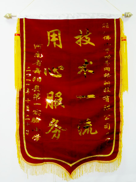 近日,河南省漯河市舞陽縣第一實驗小學將一封感謝信以及兩面表揚錦旗送到了動易公司,嶄新的錦旗上分別書著“用心服務 技術一流”和“鑄友誼 用動易 助力教育”,表達了對動易客服人員葉長海、技術支持工程師李寧寧在舞陽縣第一實驗小學校園網(wǎng)建設過程中的優(yōu)質服務的感謝之情,同時也對動易產(chǎn)品做出了很高的評價。