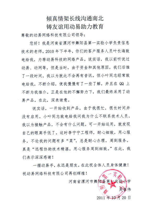 河南省漯河市舞陽縣第一實驗小學于今年5月選擇了動易軟件產(chǎn)品作為校園網(wǎng)軟件平臺,購買前期 ,客戶對于動易客服人員葉長海的用心服務,始終站在客戶發(fā)展角度,想客戶所想的專業(yè)素質表達了贊賞和感謝。之后,動易的技術工程師李寧寧在售后技術支持服務中用心、耐心細致的為客戶解決問題,服務非常到位和盡心,又得到客戶的不斷好評。