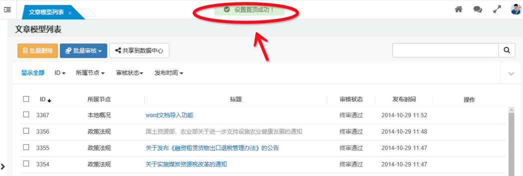 如下圖,以設(shè)置某篇文章為置頂文章,設(shè)置后在當前頁面直接操作成功并提示操作信息。