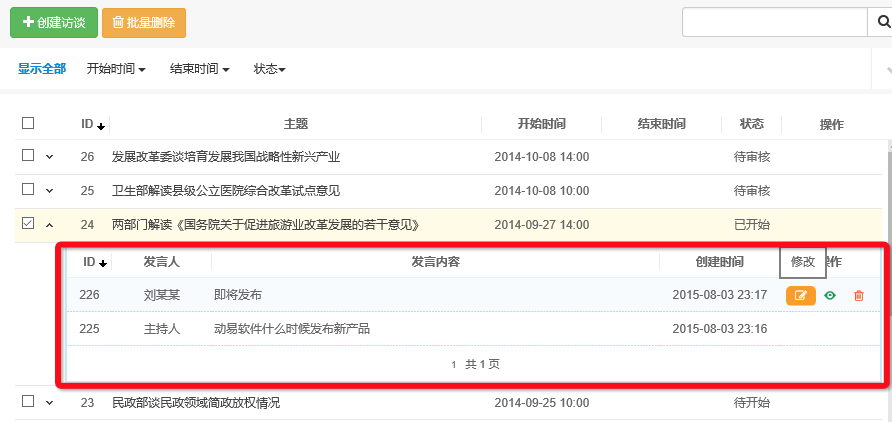 值得一提的是新信息列表還支持子表格的特性,能夠很好的幫助后臺管理人員查閱相關(guān)列表信息。下面以在線訪談功能的子表格特性為例,快速查閱單條訪談信息里的訪談實錄的內(nèi)容。