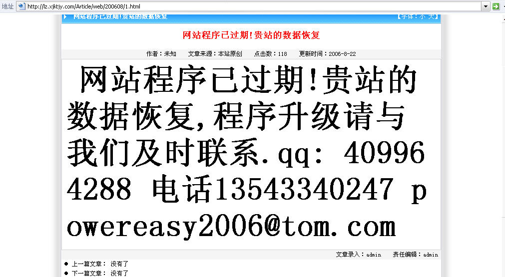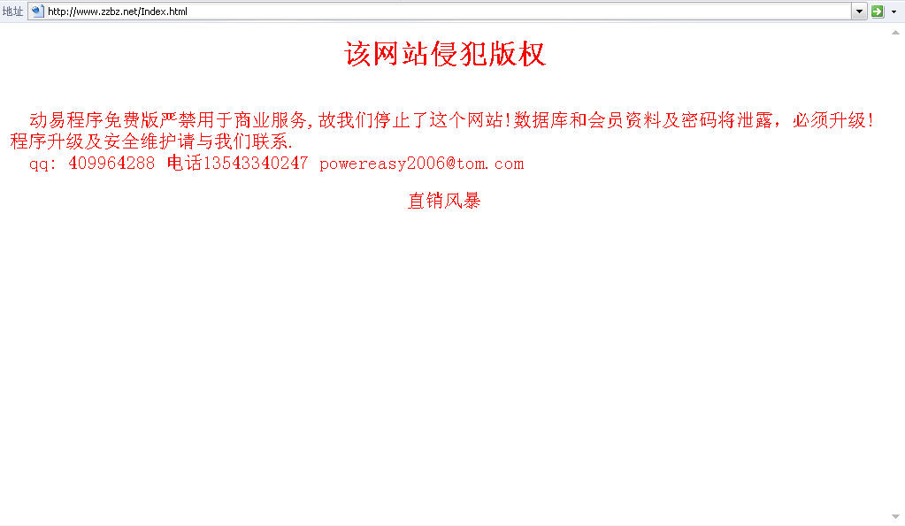 近日,動易公司接到用戶反應和舉報,其使用的動易普及版網(wǎng)站被黑客攻擊,黑客不僅在網(wǎng)站上標注“因為動易免費版嚴禁用于商業(yè)服務,所以停止了此網(wǎng)站……”字樣,還破壞了網(wǎng)站數(shù)據(jù),且留有QQ、電話、郵箱等聯(lián)系方式要求站長與之聯(lián)系進行程序上的升級,并注明“直銷風暴”。(見附圖)
