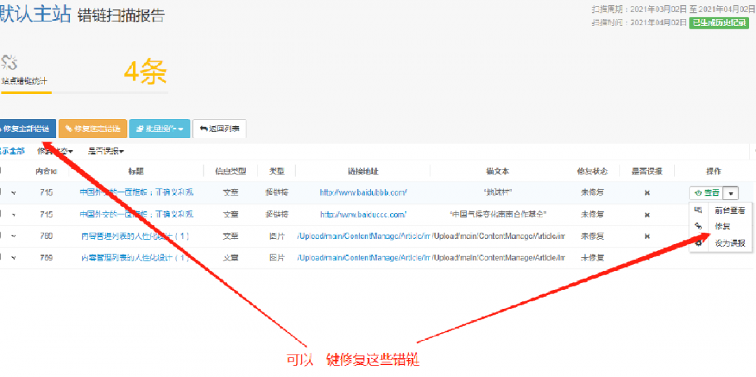 錯(cuò)鏈掃描與修復(fù)功能,輕松消除錯(cuò)鏈。也可按照平臺(tái)預(yù)先配置的修復(fù)方案來一鍵執(zhí)行修復(fù)。