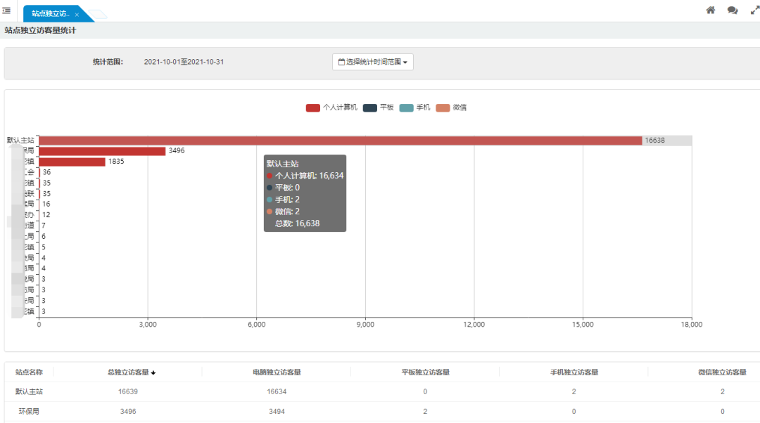 站點(diǎn)瀏覽量明細(xì)提供折線圖、柱形圖等數(shù)據(jù)表現(xiàn)形式,有利于了解站點(diǎn)的訪問情況和訪問者關(guān)注分布情況。