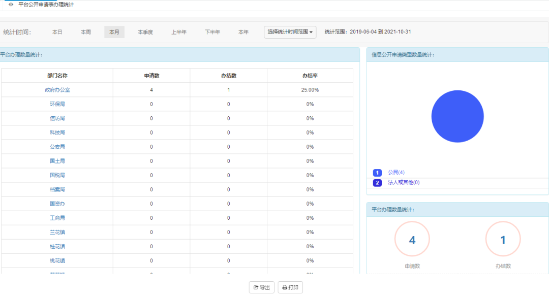所有公開申請(qǐng)表辦理統(tǒng)計(jì):可以對(duì)所有公開申請(qǐng)表辦理進(jìn)行統(tǒng)計(jì),可選統(tǒng)計(jì)時(shí)間范圍來統(tǒng)計(jì)。