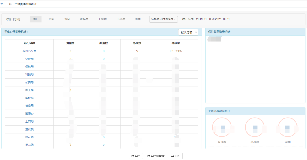 所有信件辦理統(tǒng)計(jì):可平臺(tái)對(duì)所有信件辦理數(shù)量、結(jié)果進(jìn)行統(tǒng)計(jì),可選擇統(tǒng)計(jì)時(shí)間范圍。
