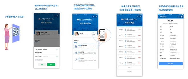 班主任可以掃描學生的報到二維碼進行驗證,也可以查看未報到/已報到的學生列表。