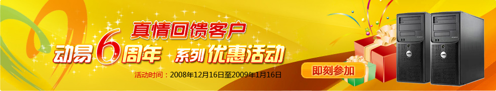 值此動易6周年即將到來之際,動易公司特別推出“動易6周年真情回饋客戶優(yōu)惠活動”。只要您在活動期間購買動易軟件授權(quán)的同時購買“暢享安全、輕松業(yè)務(wù)”服務(wù)套餐,即可享受6折的首年服務(wù)套餐優(yōu)惠