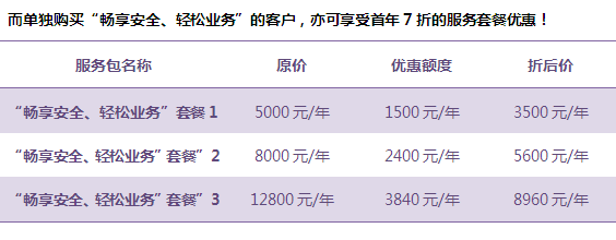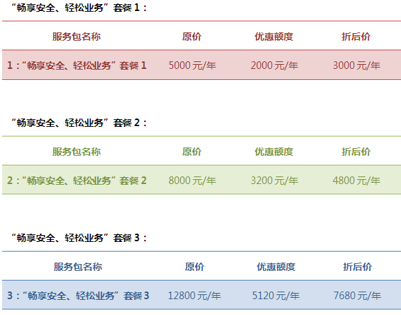 服務(wù)項目 | 暢享安全 輕松業(yè)務(wù) 套餐1 | 暢享安全 輕松業(yè)務(wù) 套餐2 | 暢享安全 輕松業(yè)務(wù) 套餐3 |