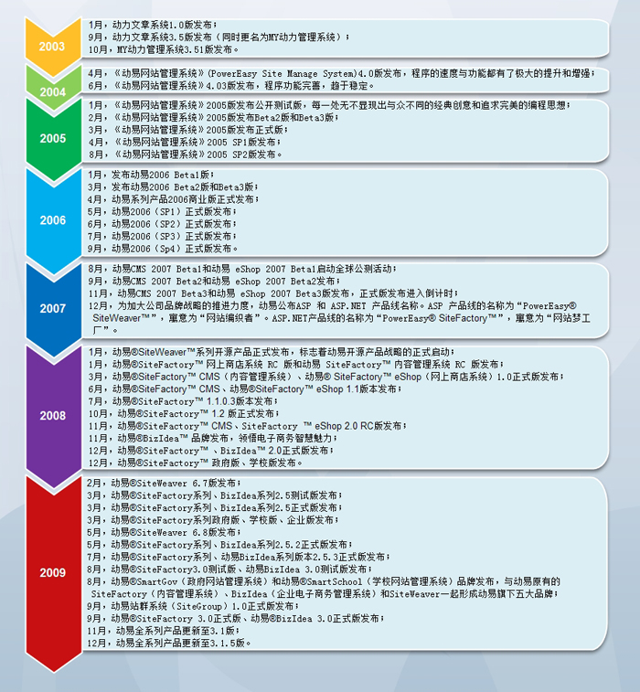 回望一路走來的七個年頭,從最初的動力文章1.0版,到現(xiàn)在的全系列產(chǎn)品3.1.6版,動易產(chǎn)品歷經(jīng)了上百次大小版本的發(fā)布,而秉持著“精益求精”的研發(fā)理念,動易產(chǎn)品也進行了數(shù)次的改革和創(chuàng)新: