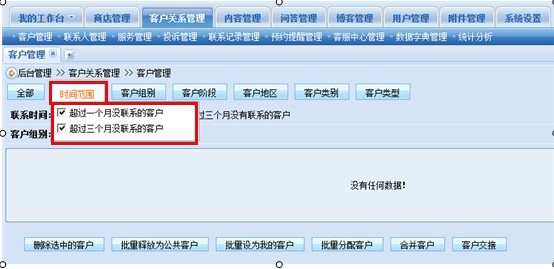 如果您想按時(shí)間范圍查找一批客戶資料,那么將鼠標(biāo)停留在“時(shí)間范圍”一欄上,功能鍵下方便會(huì)出現(xiàn)時(shí)間范圍“超過(guò)一個(gè)月沒(méi)有聯(lián)系的客戶”和“超過(guò)三個(gè)月沒(méi)有聯(lián)系的客戶”,按照需求點(diǎn)擊相應(yīng)的選項(xiàng),便可查詢(xún)到您需要的客戶資料。