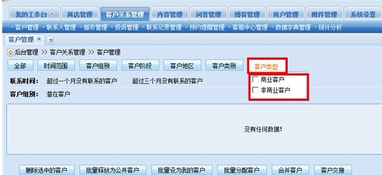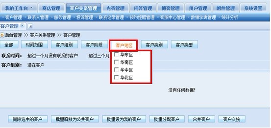 系統(tǒng)后臺(tái)界面客戶管理中,我們可以看到管理列表中有7欄不同的分類(lèi),可以按照時(shí)間范圍、客戶組別、客戶階段、客戶地區(qū)、客戶類(lèi)別、客戶類(lèi)型、全部客戶等條件進(jìn)行客戶搜索。如圖: