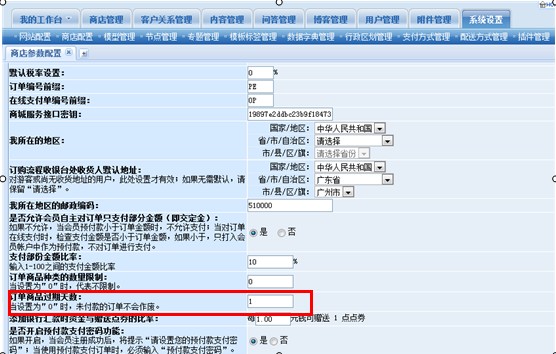 接下來(lái),我們?cè)谏痰陞?shù)配置的界面中可以看到“訂單商品過(guò)期天數(shù)”設(shè)置選項(xiàng)??梢愿鶕?jù)您的實(shí)際需求來(lái)設(shè)置訂單提交多久未付款便自動(dòng)關(guān)閉,在旁邊的空格中填寫(xiě)相應(yīng)的天數(shù),當(dāng)設(shè)置為“0”時(shí),為付款的訂單將不會(huì)作廢。