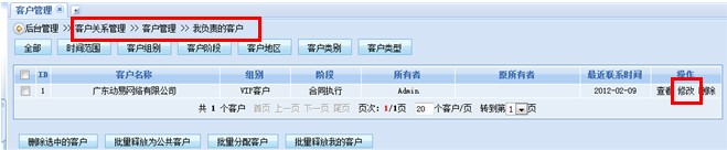 首先,進(jìn)入首先進(jìn)入系統(tǒng)后臺(tái)“客戶關(guān)系管理”界面,在“我的客戶”中點(diǎn)擊“修改”功能按鈕。