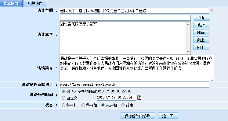 當(dāng)需要?jiǎng)?chuàng)建新一期的在線訪談節(jié)目時(shí),用戶簡(jiǎn)單錄入訪談主題、嘉賓、簡(jiǎn)介、訪談視頻直播地址、開(kāi)始時(shí)間、摘要、背景資料等信息后,便可快速創(chuàng)建起新的訪談節(jié)目。