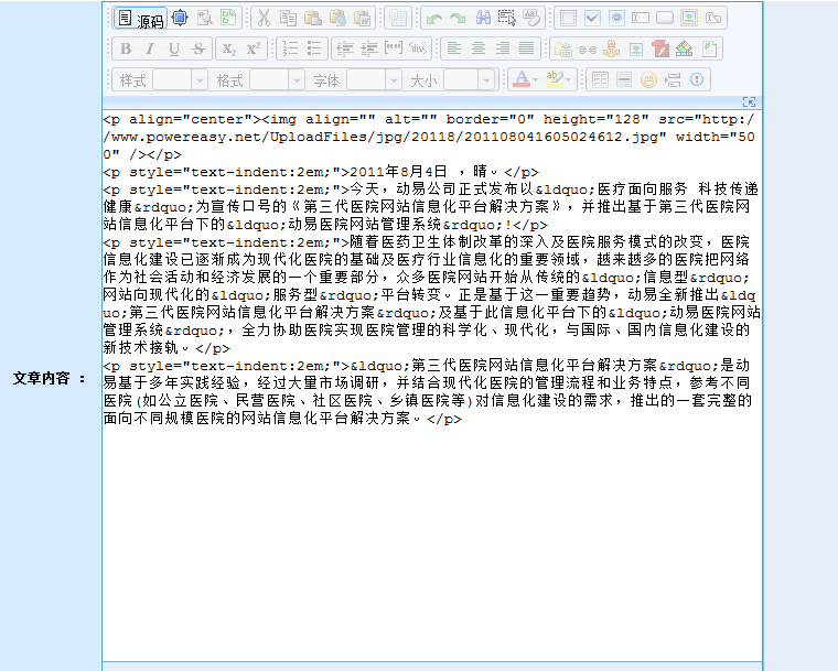 在動(dòng)易后臺(tái),進(jìn)入“添加文章頁面”,在編輯器中輸入文字,添加圖片后,此時(shí)文章無格式: