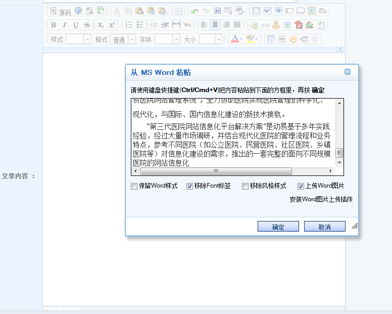 在動(dòng)易后臺(tái),進(jìn)入“添加文章頁面”,在編輯器中從MS Word粘貼剛復(fù)制的文章: