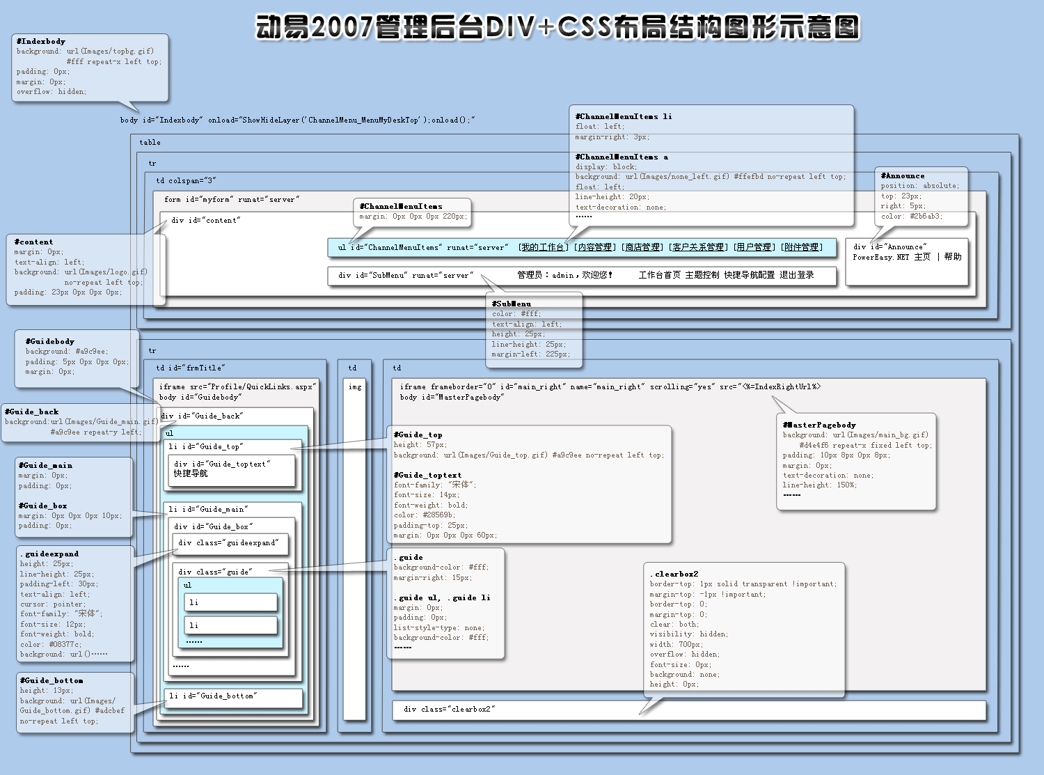 如果要完全修改管理后臺的布局與樣式,則需要修改到上述相關(guān)文件。.aspx和.css文件相配合,控制后臺頁面結(jié)構(gòu)與樣式,在了解管理后臺設(shè)計(jì)前,請先仔細(xì)閱讀并理解管理后臺的結(jié)構(gòu)圖形示意圖: