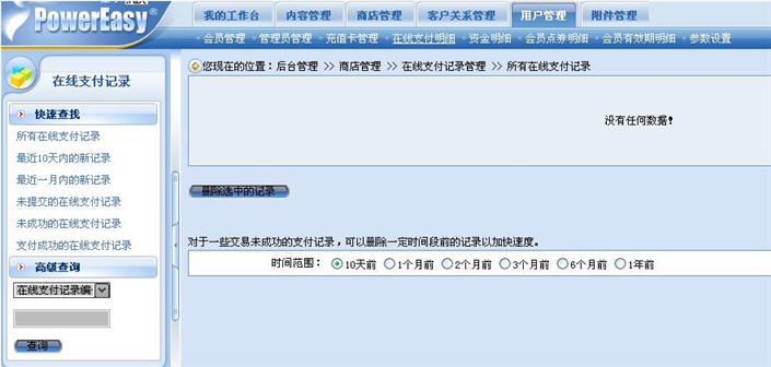 該功能可以讓商家清楚地了解店鋪發(fā)生的每一筆顧客購買商品進行在線支付的情況,當商家要進行顧客支付確認的時候,該功能允許商家根據(jù)支付時間、用戶名或在線支付編號進行交易支付記錄的快速檢索。此外,動易eShop2007也內(nèi)置了一些常用的條件查詢功能菜單,如查詢“所有的記錄”、“最近10天的記錄”、“最近一個月的記錄”、“未提交的在線支付記錄”、“未成功的在線支付記錄”等,以方便商家快速了解網(wǎng)店顧客購買商品的支付情況,更高效地進行網(wǎng)店的收款管理。
