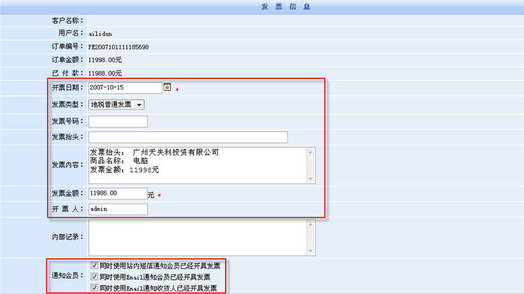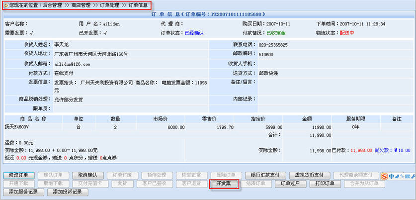 在動易eShop2007里,為顧客開發(fā)票是通過這個步驟進行的:后臺管理——商店管理——訂單處理——訂單信息——開發(fā)票。