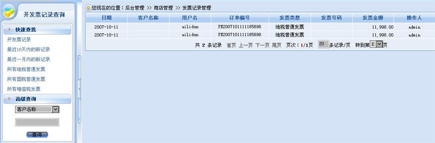 系統(tǒng)提供了快速查找功能,預(yù)置了一些常用查詢。除了可以通過時間進行查詢之外,還可以對開票的類型進行查詢,另外,在高級查詢功能中,商家可以指定“客戶名稱”、“開票人”選、“開票日期”,來進行查詢,而不用從訂單中來查看開票的信息,極大的提高財務(wù)發(fā)票管理的效率。