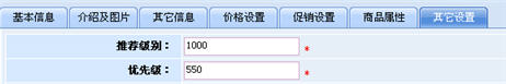 “推薦級(jí)別”對(duì)應(yīng)前臺(tái)的推薦商品,“優(yōu)先級(jí)別”則對(duì)應(yīng)前臺(tái)的固頂商品。因?yàn)閯?dòng)易eShop2007的默認(rèn)模板是設(shè)置了通過(guò)前臺(tái)調(diào)用標(biāo)簽的方式來(lái)顯示推薦商品和固頂商品的,所以推薦級(jí)別和優(yōu)先級(jí)別的最小設(shè)置數(shù)可以由用戶自行在標(biāo)簽里進(jìn)行設(shè)置;如果用戶是自行設(shè)計(jì)模板的話,也可以選擇直接顯示而不通過(guò)標(biāo)簽調(diào)用的方式在前臺(tái)顯示。在動(dòng)易eShop2007默認(rèn)模板里,推薦級(jí)別和優(yōu)先級(jí)別的設(shè)置數(shù)量分別是大于99和大于500,也就是說(shuō),當(dāng)在推薦級(jí)別或優(yōu)先級(jí)別一欄填寫了大于99或者大于500的數(shù)字時(shí),該商品將自動(dòng)在前臺(tái)推薦商品或固頂商品一欄中顯示。