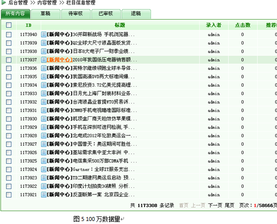 小結:動易SiteFactory的后臺管理可以輕松承載100萬的數(shù)據(jù),并且和10萬數(shù)據(jù)時相比,沒有任何性能上的衰減。無論是10萬數(shù)據(jù)還是100萬數(shù)據(jù),后臺管理的幾個主要頁面的打開時間都在0.2秒以內,可以說是“閃電”來形容,絕對是“飛快”的級別。