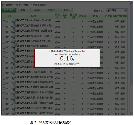 為了不讓ASP.NET的特性影響生成速度,先生成某個只有10篇文章的欄目列表,再生成此欄目的列表并計時。