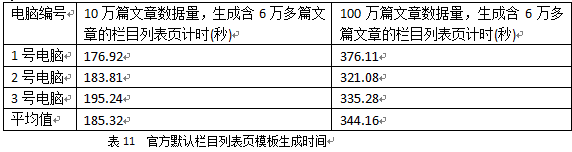 4)為上述欄目使用官方默認的欄目列表頁模板,生成欄目列表頁,計時。模板的前臺顯示效果見下圖: