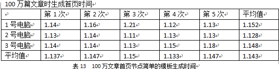 小結:動易SiteFactory2.0的首頁的生成速度可以說用“飛快”來形容,無論是10萬數(shù)據(jù)還是100萬數(shù)據(jù),無論是簡單模板還是復雜模板,首頁的HTML生成速度都在1秒左右。從數(shù)據(jù)中也可以看出來,同樣的模板時,10萬數(shù)據(jù)和100萬數(shù)據(jù)在生成HTML時沒有太大的性能差異,但模板的復雜度則直接影響了生成速度,模板越復雜,調用的標簽越多,性能衰減得越厲害。