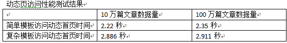 小結:動易SiteFactory2.0的首頁的訪問速度可以說用“飛快”來形容,無論是10萬數(shù)據(jù)還是100萬數(shù)據(jù),無論是簡單模板還是復雜模板,首頁的HTML生成速度都在3秒左右。從數(shù)據(jù)中也可以看出來,同樣的模板時,10萬數(shù)據(jù)和100萬數(shù)據(jù)在生成HTML時沒有太大的性能差異,但模板的復雜度則直接影響了生成速度,模板越復雜,調用的標簽越多,性能衰減得越厲害。