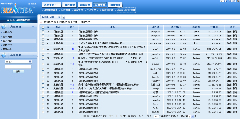 動易問答系統(tǒng)具備了大多數(shù)問答系統(tǒng)平臺的功能特性,包括問題類型管理、問題管理、答案管理、評論管理、頭銜系列管理、問答積分明細管理、問答參數(shù)配置等后臺功能和問題懸賞排行、用戶積分排行、本周解答之王、我的問答、熱點問答、問題答案搜索等等。