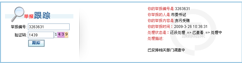 公眾在前臺可以輸入舉報編號來實時查詢到所舉報事件的處理情況和處理結(jié)果。