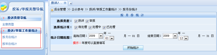 為方便政府對投訴舉報工作的處理情況進行檢查和監(jiān)督,系統(tǒng)提供了工作量統(tǒng)計功能。為符合政府部門日常工作習慣,內(nèi)置“按月份”和“按年份”對信息進行工作量統(tǒng)計。