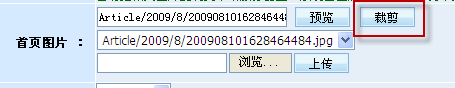 在后臺文章添加頁面,我們可以看到首頁圖片上傳地址欄后多了一個“裁剪”的按鈕,沒錯,當我們將圖片上傳后就可以進行在線裁剪了。點擊“裁剪”按鈕,系統(tǒng)將以Ajax無刷新方式打開圖片裁剪操作窗口: