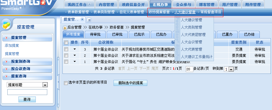 傳統(tǒng)政務(wù)督查系統(tǒng)只包含政協(xié)提案和人大建議系統(tǒng),缺乏對(duì)常規(guī)提案的管理。為彌補(bǔ)傳統(tǒng)政務(wù)督查管理系統(tǒng)的不足,SmartGov 政務(wù)督查系統(tǒng)集成了。