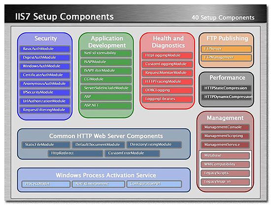 在IIS7中,.NET應用程序直接通過IIS代碼運行而不再發(fā)送到Internet Server API擴展上,這樣就減少了可能存在的風險,并且提升了性能,同時管理工具內(nèi)置對ASP.NET 3.0的成員和角色管理系統(tǒng)提供管理界面的支持。這意味著用戶可以在管理工具里,創(chuàng)建和管理角色和用戶,以及給用戶指定角色,下面是IIS 7 完整的組件分報圖。
